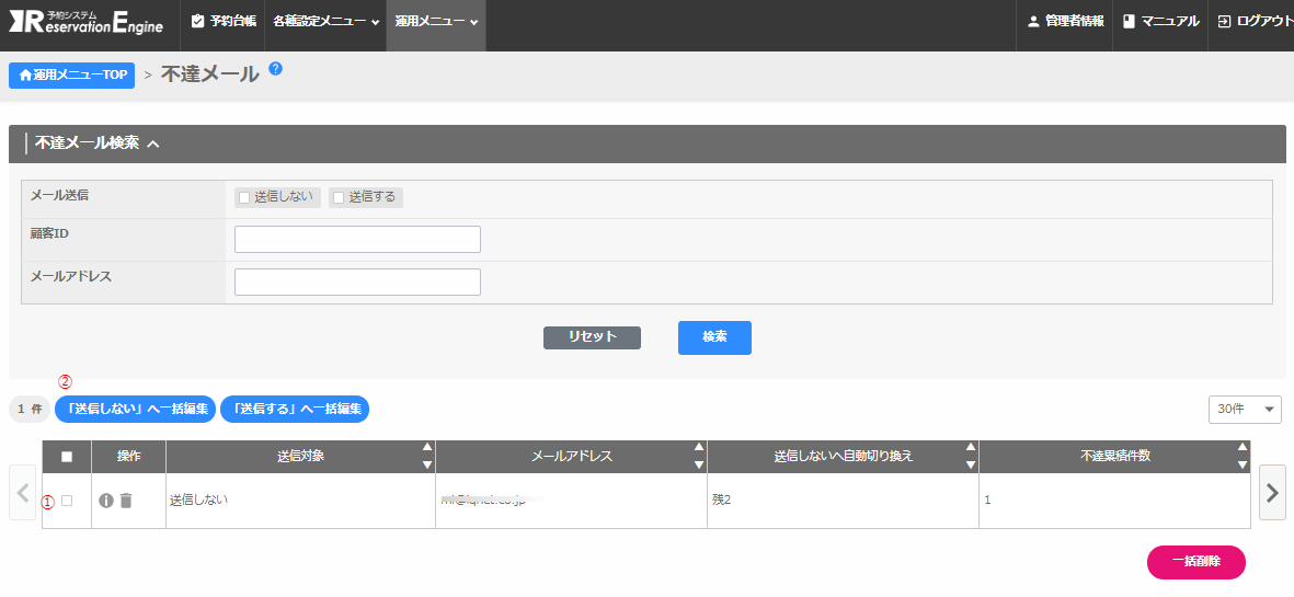 運用メニュー「不達メール」に登録されていないか確認ください。