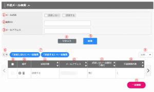 ⑥ 登録件数⑦ 「送信しない」へ一括編集/「送信する」へ一括編集⑧ 件数⑨ チェック⑩ 操作⑪ 送信対象⑫ メールアドレス⑬ 送信しないへ自動切り換え⑭ 不達累積件数⑮ 一括削除