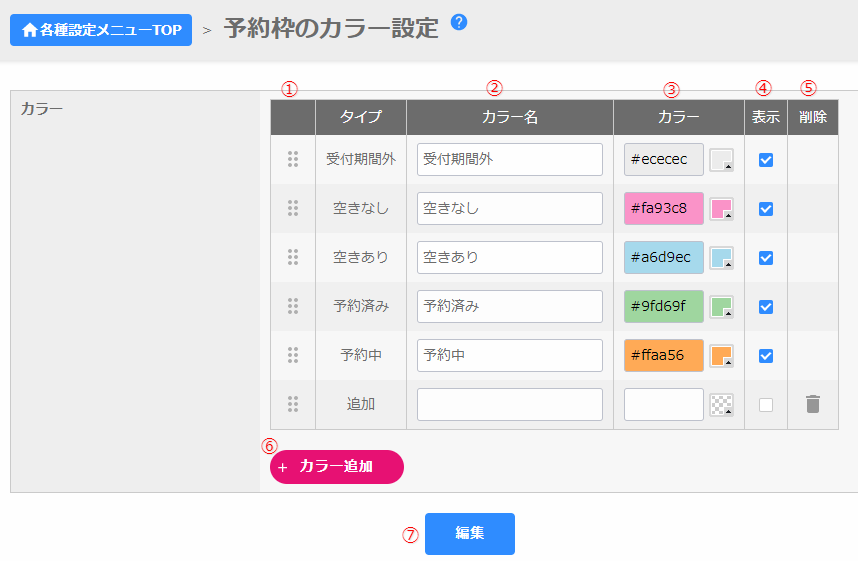 ① (項目順番変更)② カラー名③ カラー④ 表示⑤ 削除⑥ カラー追加⑦ 編集
