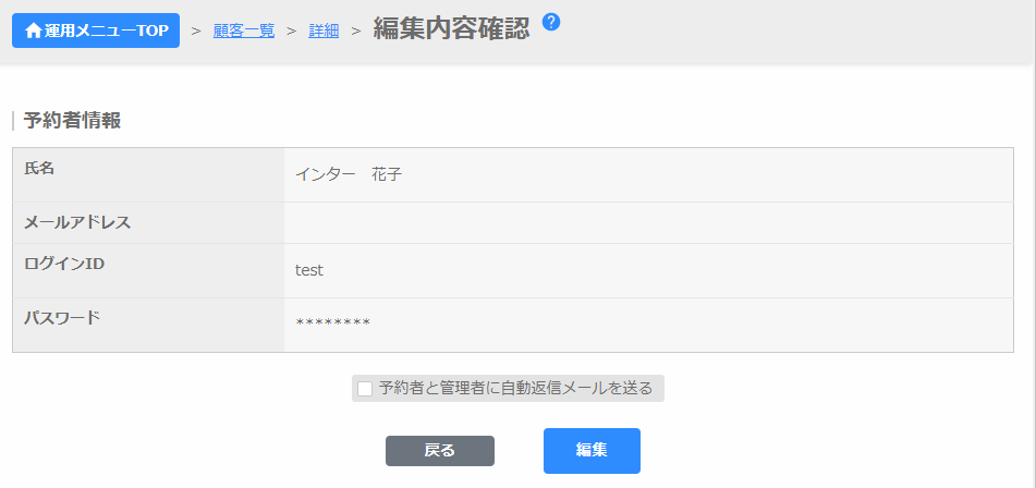 「予約者と管理者に自動返信メールを送る」にチェックを入れてから「編集」すると、メール種別「会員変更」の自動返信メールが送られます。