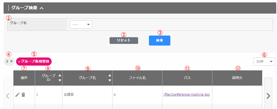 ④ 登録件数⑤ グループ新規登録⑥ 件数⑦ 操作⑧ グループID⑨ グループ名⑩ ファイル名⑪ パス⑫ 説明文