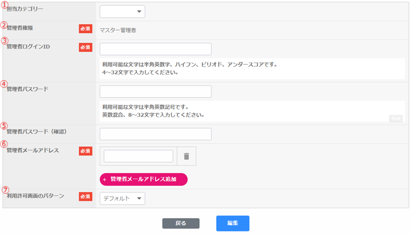 ① 担当カテゴリー② 管理者権限③ 管理者ログインID④ 管理者パスワード⑤ 管理者パスワード(確認)⑥ 管理者メールアドレス