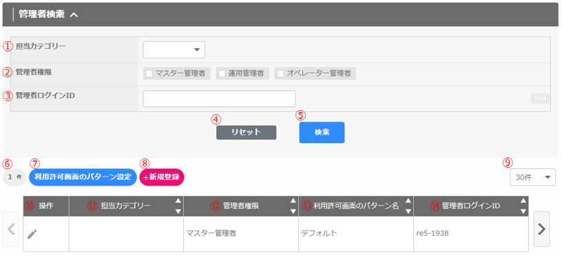 ① 担当カテゴリー② 管理者権限③ 管理者ログインID④ リセット⑤ 検索