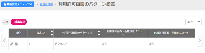 利用許可画面のパターン設定では画面毎に利用可能な範囲を指定することが可能です。
