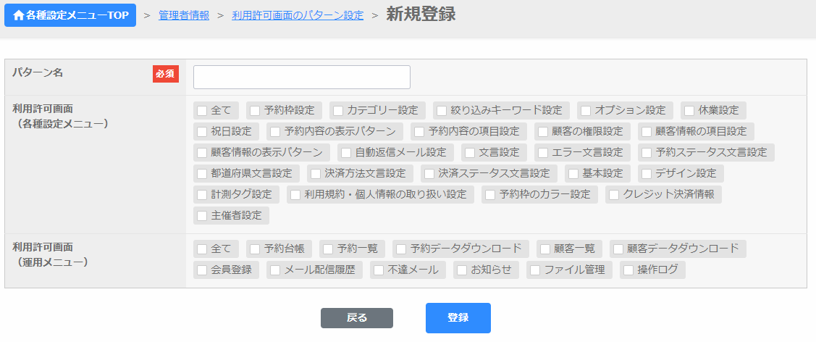 パターンは複数登録することが可能で、管理者情報 新規登録/編集から管理者毎に自由に指定が可能です。