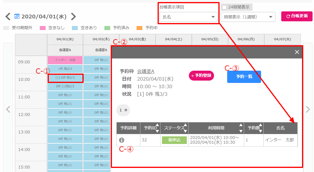 仮申込の予約が入っている枠は、C-①のように表示されます。
