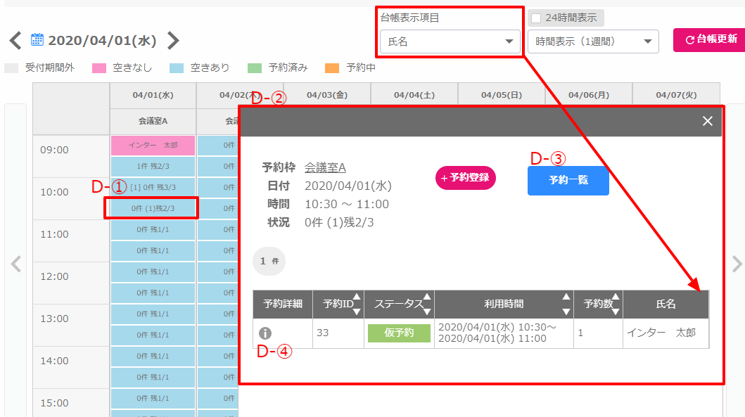 仮予約の予約が入っている枠は、D-①のように表示されます。