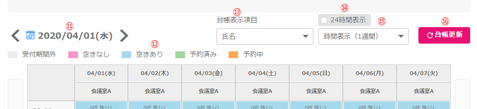 ⑪ カレンダー表示日⑫ 予約枠のカラー設定⑬ 台帳表示項目⑭ 24時間表示⑮ 表示タイプ⑯ 台帳更新