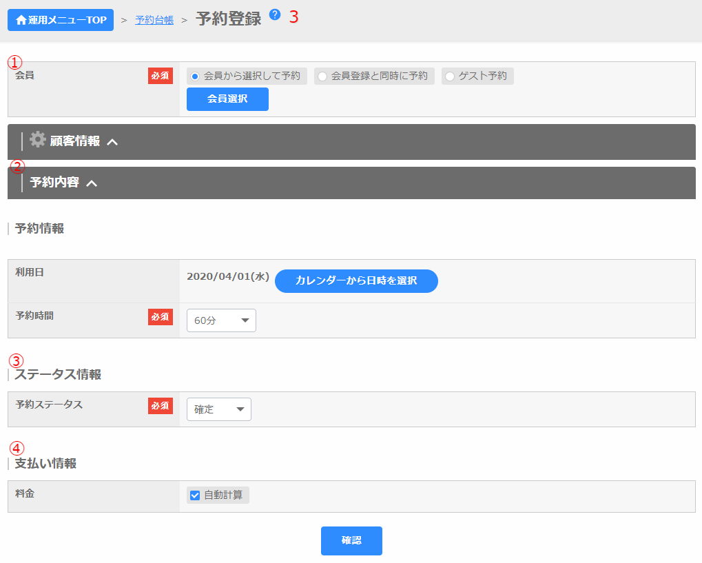3.予約登録画面に移動します。登録後、一番下にある「確認」をクリックします。