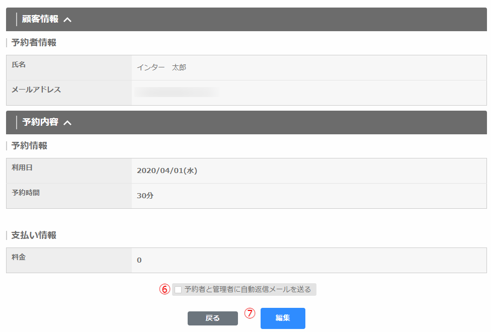 「予約者と管理者に自動返信メールを送る」にチェックを入れてから「編集」すると、メール種別「予約登録」の自動返信メールが送られます。