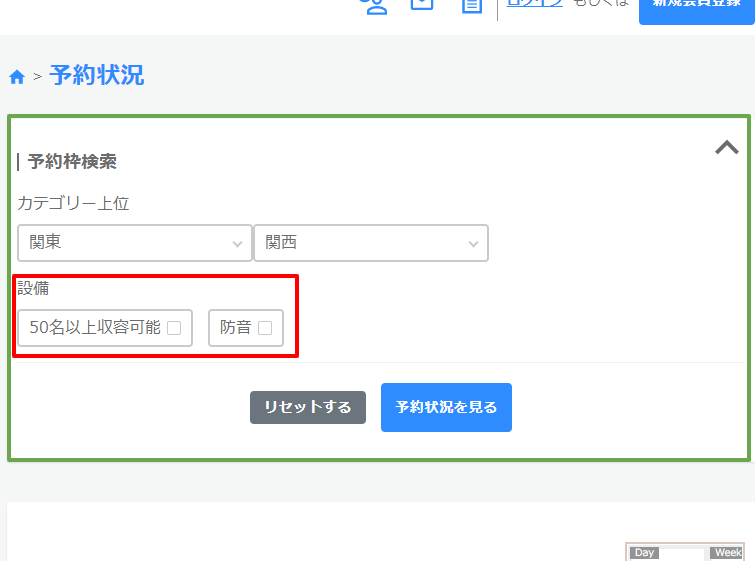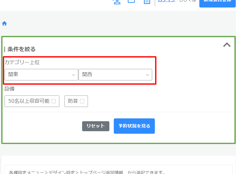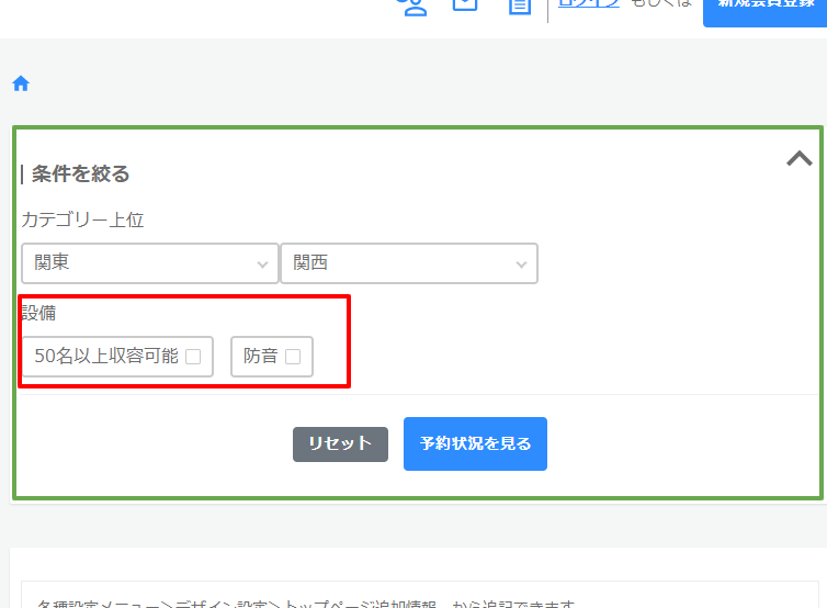 ※「カテゴリー(予約状況)」と「絞り込みキーワード(予約状況)」のどちらも「利用しない」で設定した場合、下の画像の緑枠自体が表示されません。