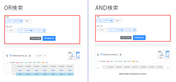 「50名以上収容可能」が設定されていて、かつ「11名~50名未満」と「50名以上」のどちらも設定されている予約枠が表示されるため