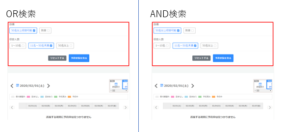 「50名以上収容可能」が設定されていて、かつ「11名~50名未満」か「50名以上」のどちらかが設定されている予約枠が表示されるため