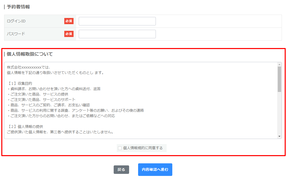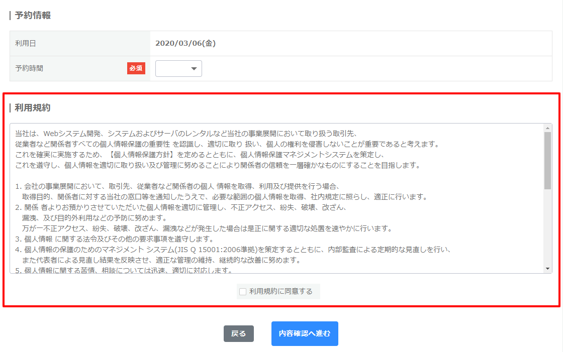 利用する:予約登録時に表示され、同意(チェック)しないと、予約できません。