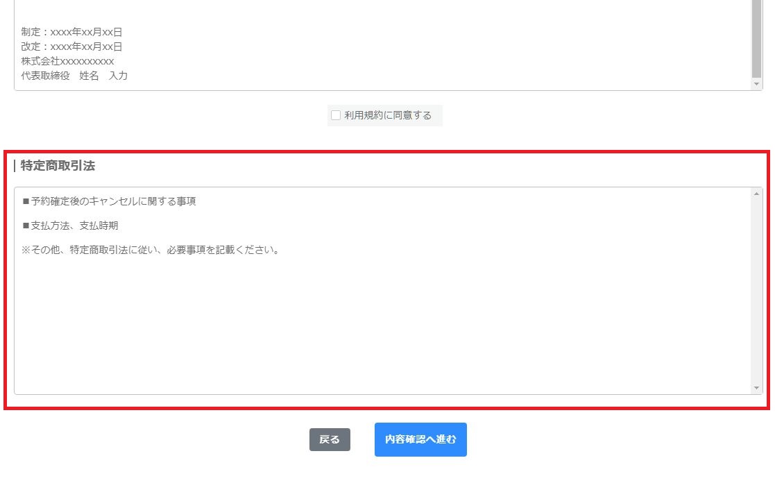 予約サイトのトップページに特定商取引法を表示することができます。