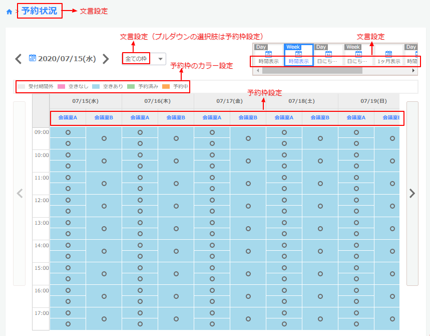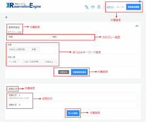 予約枠設定やカテゴリー設定など設定場所か、文言設定から変更できます。