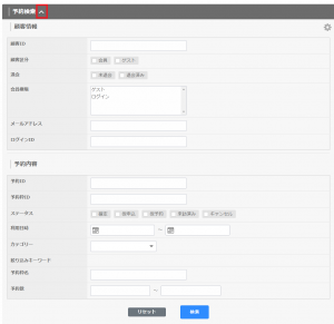 検索項目の表示がない場合は、「予約検索∨」をクリックして「予約検索∧」にしてください。