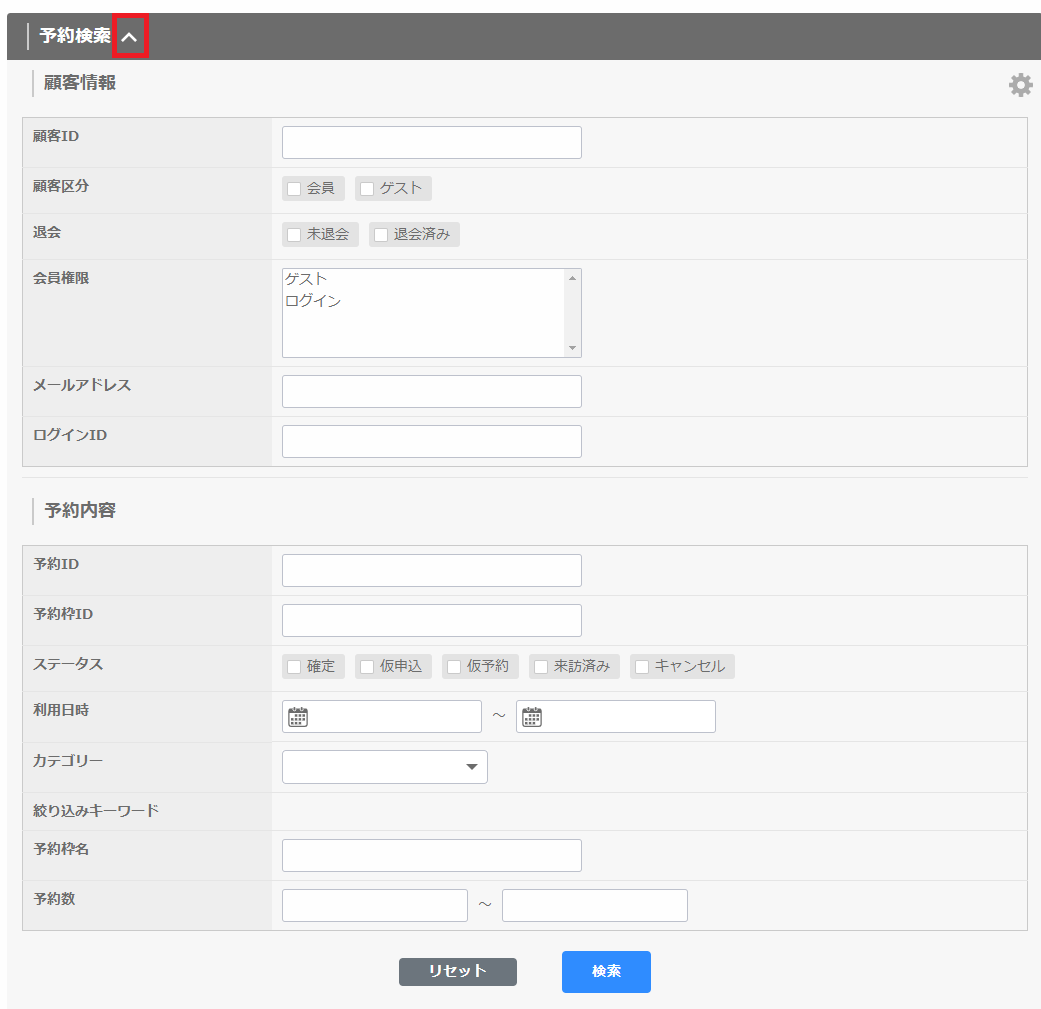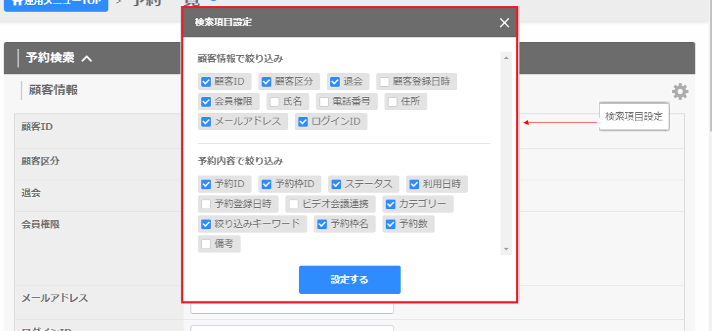 検索項目は、「顧客情報の項目設定」や「予約内容の項目設定」で登録している項目です。