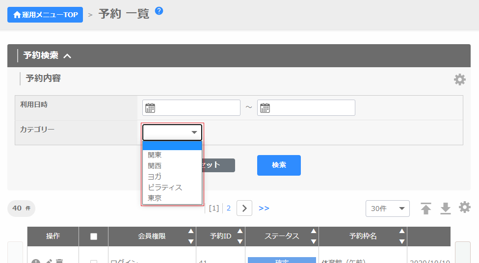 予約一覧を開くと、カテゴリー「関東」に絞った予約データが表示されます
