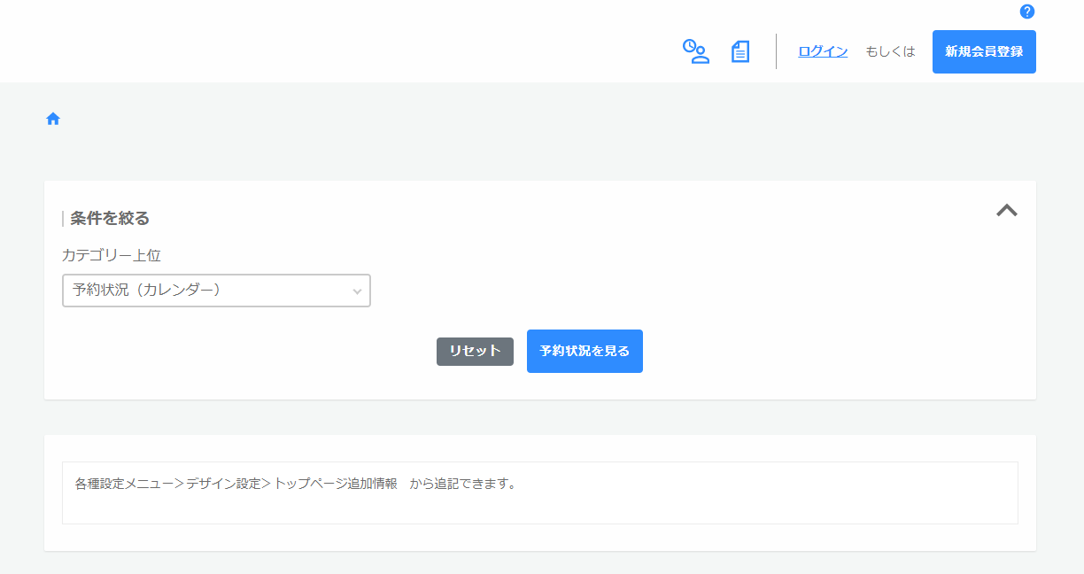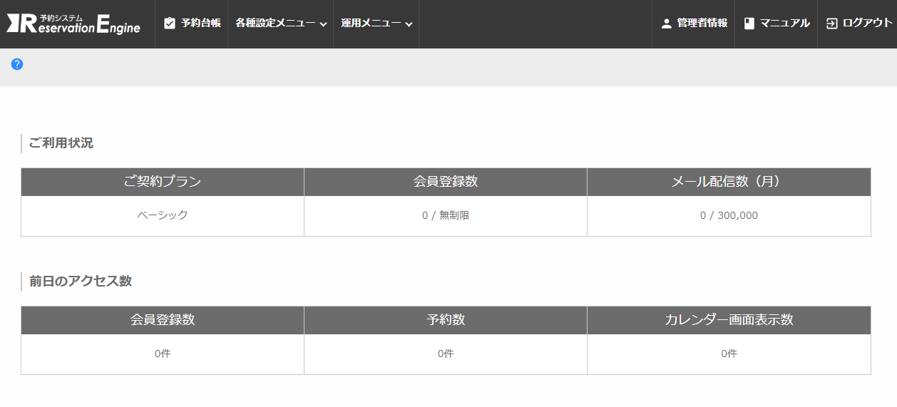 管理画面 管理者が閲覧/操作するほうの予約システムです。 予約サイト 予約者が閲覧/操作するほうの予約システムです。 管理画面 TOP 各種設定メニュー:予約枠など、予約サイトの設定をおこなうための機能が集まっています。 運用メニュー:日々の運用に必要な機能が集まっています。 予約サイト TOP