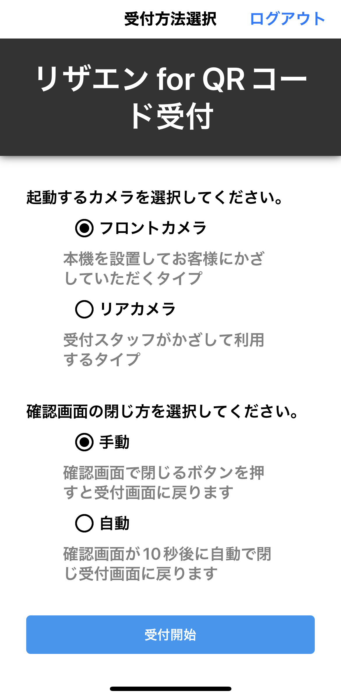 起動するカメラと受付後の確認画面の閉じ方を選択し、「受付開始」ボタンを押すと受付画面でQRコードの読み取りが始まります。
