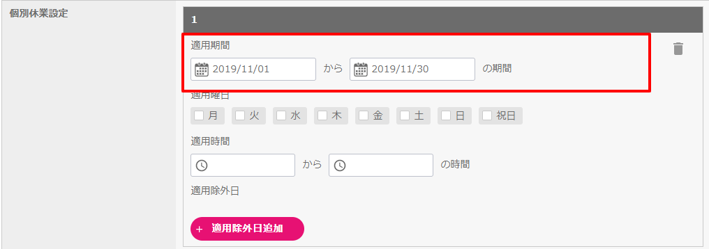 2.「例外日追加」をクリックすると設定場所が増えます。