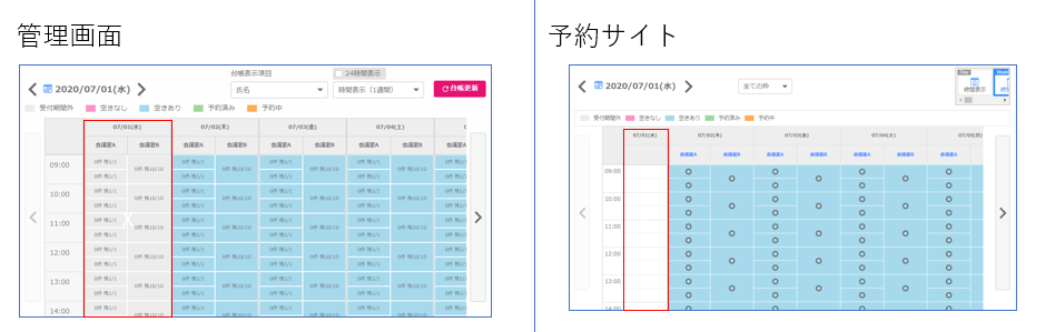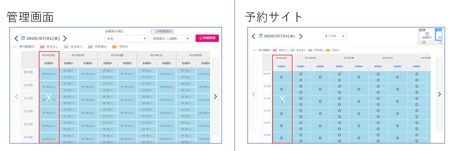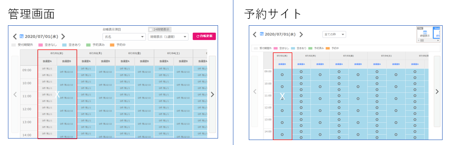 | 祝日設定※2 | 予約台帳に予約枠が存在せず、予約できません | 予約状況に予約枠が存在せず、予約できません |