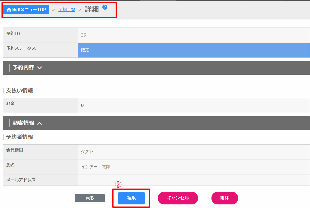 顧客一覧の詳細(①)をクリックすると、予約の詳細に移動します。