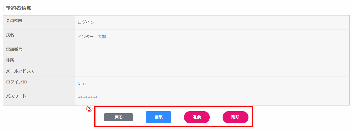 | 退会 | 退会となり、会員はログインできなくなります。 顧客情報は削除されません。 |