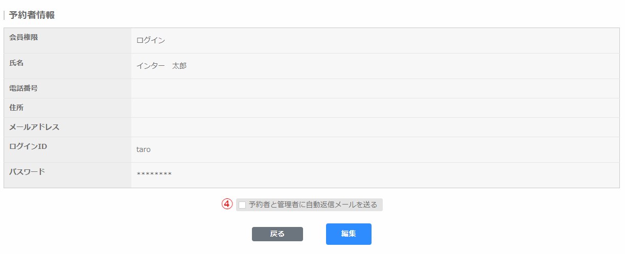 「予約者と管理者に自動返信メールを送る(④)」にチェックを入れてから「編集」をクリックすると自動返信メールが送られます。