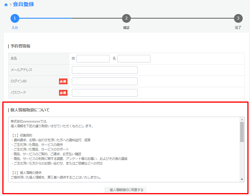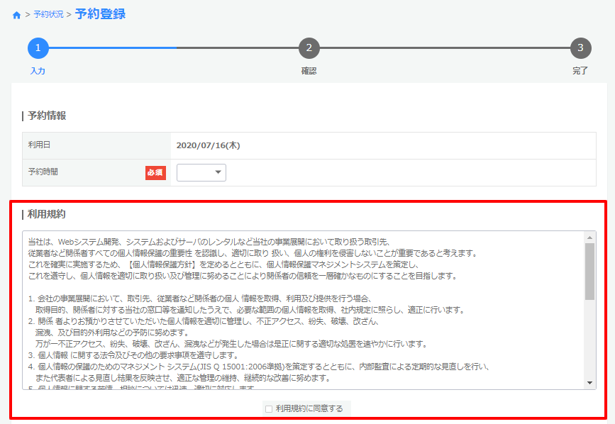 利用規約や個人情報の取り扱いについて、掲載や同意のチェックができます。